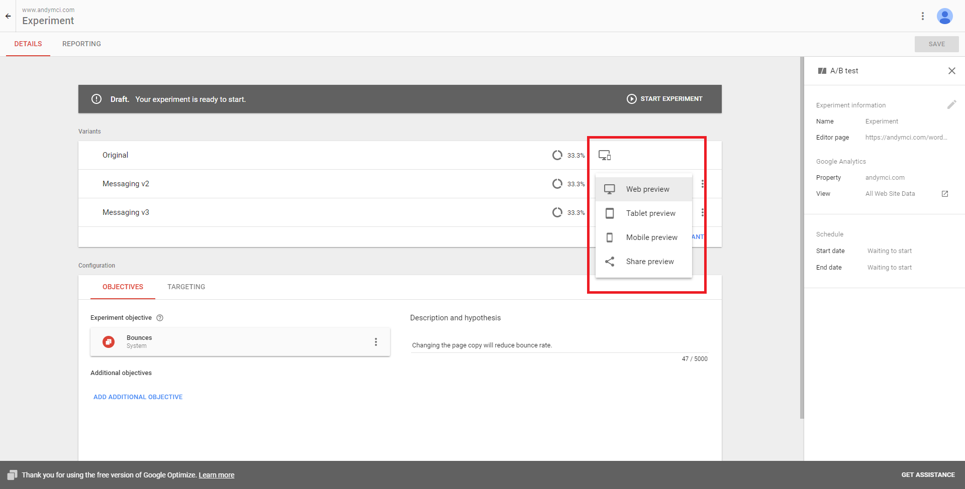 If you want to preview the variant, click on the small desktop/mobile icon. You can choose to share the preview as well – handy if you want input from someone else before the experiment goes live.