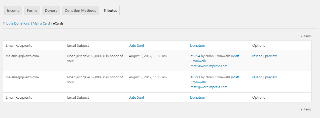 The Tributes Add-on includes the ability to track only the donors who gave in tribute of another. You can mark cards as mailed, resend eCards, and also export the data for other use.
