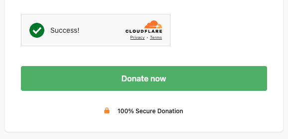 When Cloudflare Turnstile is enabled on your site with valid API keys, a Cloudflare Turnstile checkbox will appear at the bottom of your donation forms, just above the Donate button.