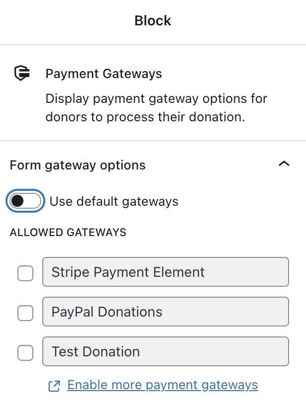 The Allowed Gateways list displays all gateways that a are currently enabled in GiveWP > Settings > Payment Gateways on the Option-Based Form Editor tab. Check the box for the gateways you would like enabled on this specific donation form. If none are checked, all the gateways that are currently enabled will be displayed.