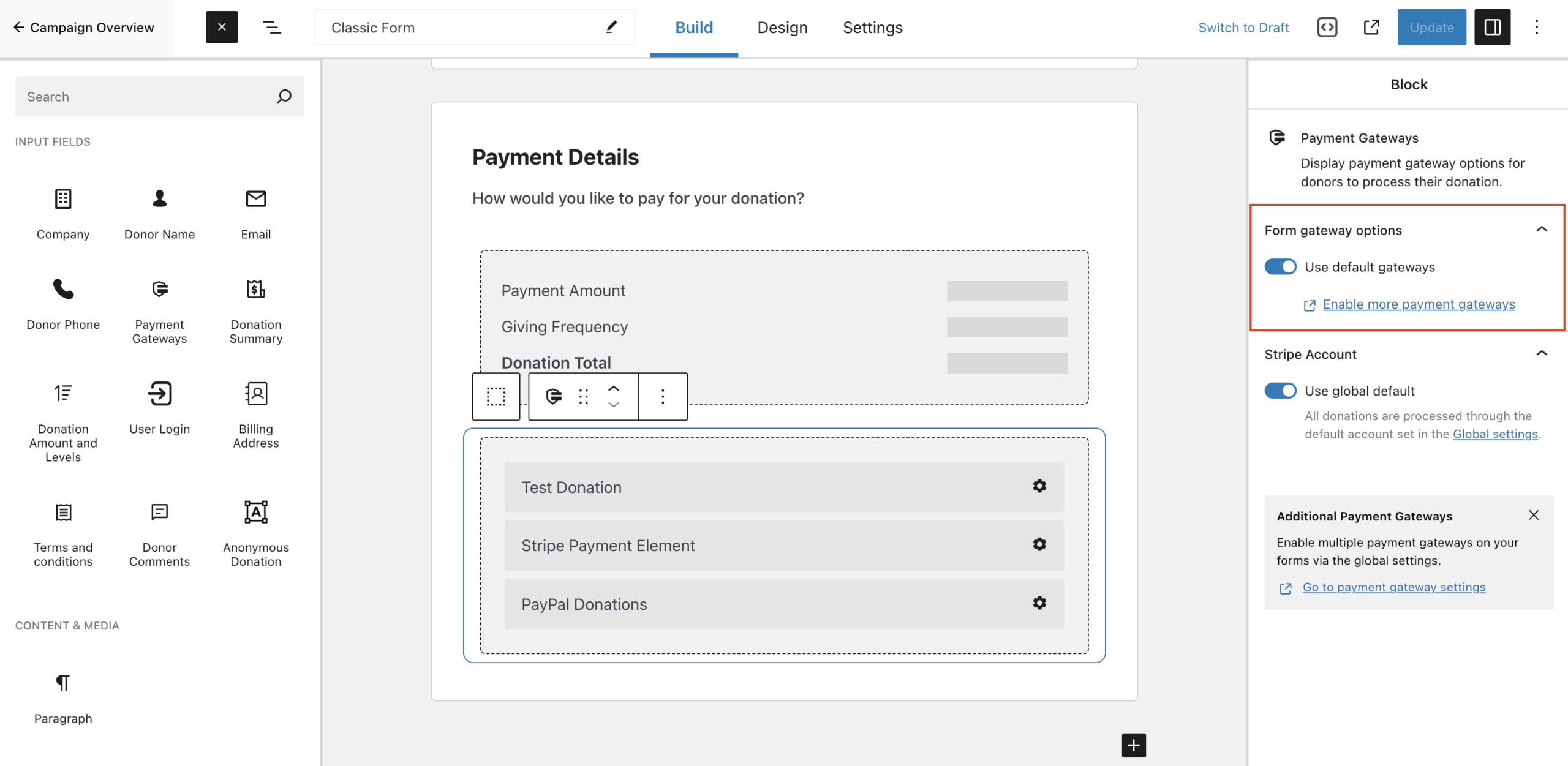 After the Per Form Gateways plugin is active, make sure you’re in the Build step at the top of the form. Next, click on the Payment Gateways block at the bottom of the form, and a new Form gateway options section will appear in the sidebar Block settings.