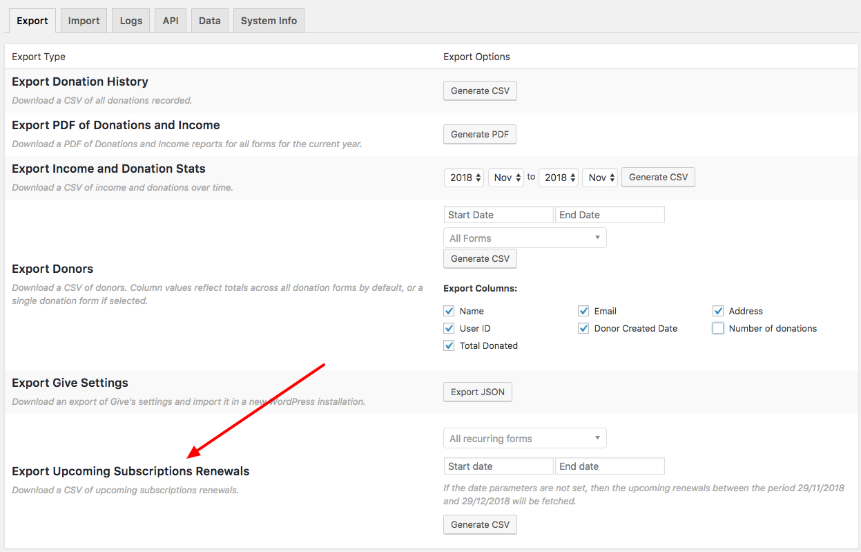 The Recurring Donations add-on extends GiveWP’s core Export toolset to allow for exporting of upcoming Renewal data. This document explains where to find that, and the various options.