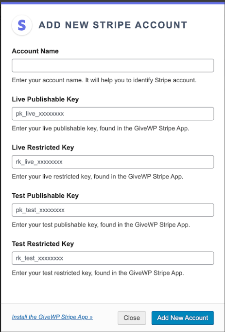 You can either use the existing keys, or use the GiveWP Stripe App to generate new keys.