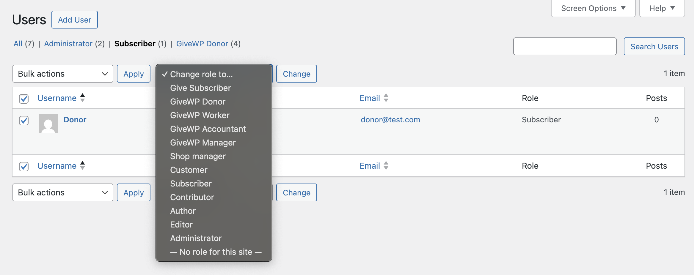 To assign a GiveWP User Role to a specific user, navigate to Users in your WordPress dashboard, then select User(s)by checking the box for each, then select the desired user role in the Change role to…. menu and click Change.