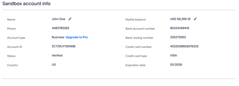 - You can use the email and system-generated password to make a donation using the test PayPal balance or you can use the bank account or credit card information found in the “Sandbox account info” section: