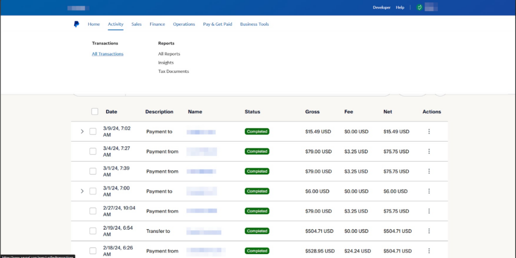 Log in to your PayPal account and go to the “Activity > All Transactions” menu.