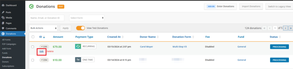 Locate the donation you would like to refund and click on the Edit link.