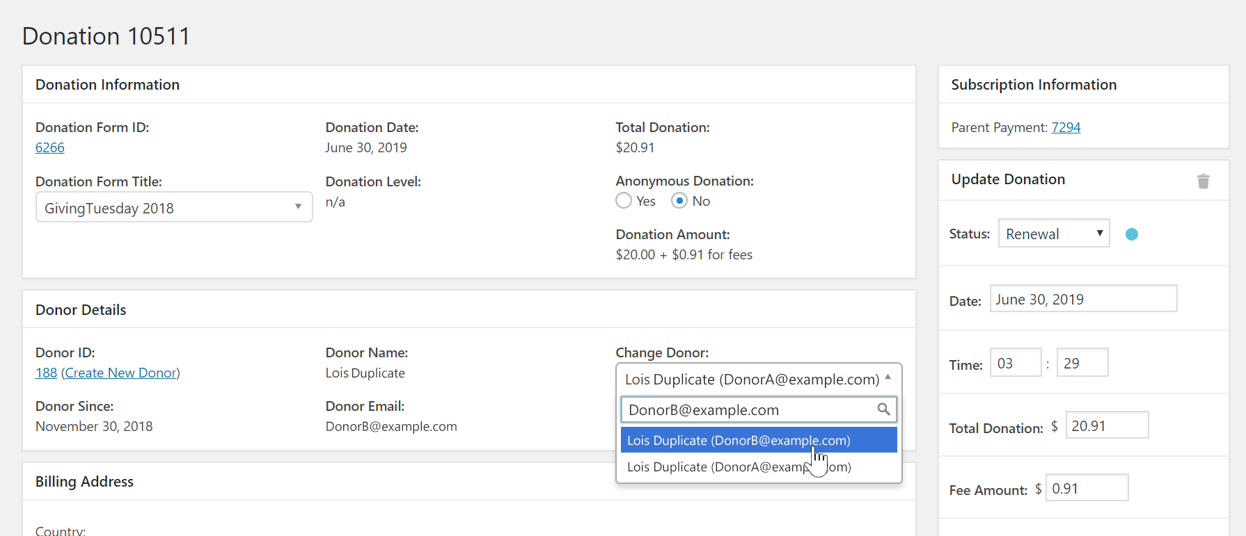 Within the donation detail screen of each individual donation, inside the “Donor Details” box click on the dropdown that says “Change Donor” and enter Donor A’s email address (DonorA@example.com) and select them as the donor once they are found.
