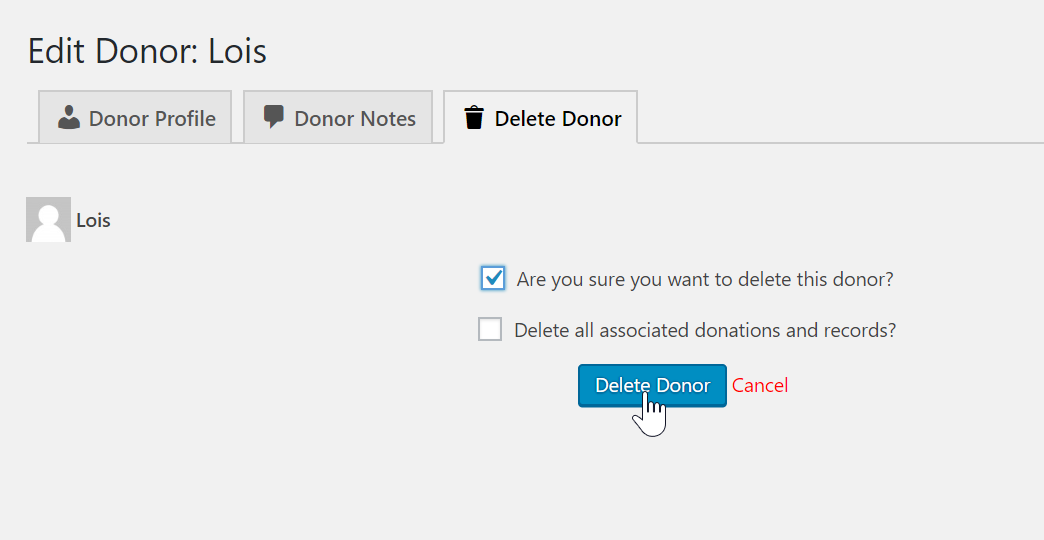 It is now safe to delete Donor B’s donor profile. If Donor B has a WordPress User attached to their donor profile, you can also disconnect that user and delete the user as well by going to the Users navigation menu item from your WordPress Dashboard.