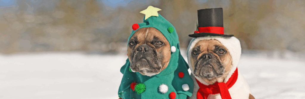 Three images in a row. Left: Woman eating a slice of pizza. Middle: Large dog with a birthday hat on. Right: Young girl baking a cupcake.